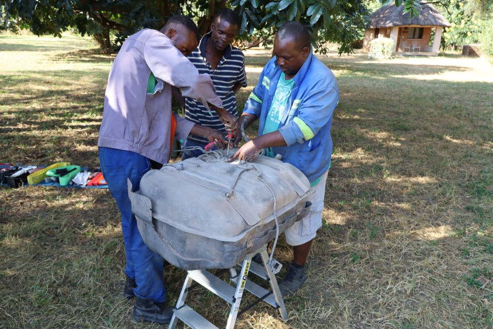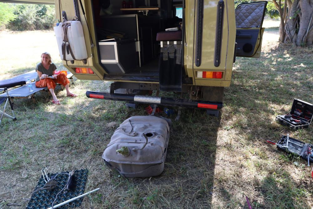 Zunächst probieren wir selbst ein bisschen rum, dann kommen Mitarbeiter der Farm, wissen aber auch nicht weiter. Spencer überprüft nochmal alle Sicherungen und meint dann, wir brauchen einen Profi. Vom Chef darf er ein  Auto leihen und aus Monze einen Mechaniker holen. Der stellt schnell die Diagnose „Benzinpumpe defekt“. Und baut, direkt an der Campsite, mit seinem Mitarbeiter und Spencer gemeinsam den Tank ab. Die Benzinpumpe wird gecheckt: kaputt. Also wieder nach Monze, neue Pumpe/Ersatzteil besorgen. Nachdem wir einen Teil des Sprits aus dem Tank in Kanister umgefüllt haben wird die neue Pumpe eingebaut und der Tank wieder montiert.