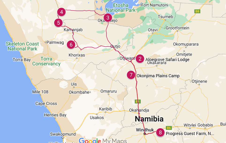 Am Ende der Woche in Deutschland erledige ich noch etwas organisatorischen Kleinkram und einen medizinischen Check, dann hole ich meine liebe Schwiegermutter ab, die sich seit ca. sechs Monaten wie Bolle auf ihre dritte Namibiareise freut. Hier die Route: