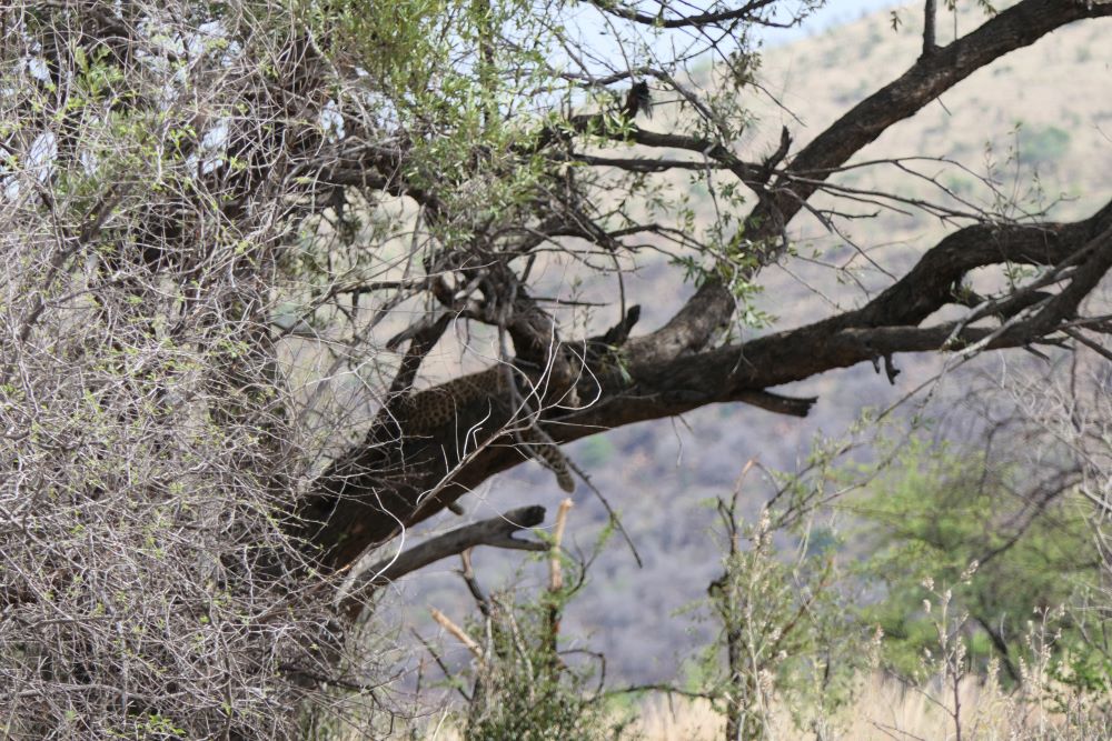 An einer Stelle „stauen“ sich diverse Autos (generell ist es im Park angenehm leer), der wunderschöne Grund: ein Leopard im Baum!