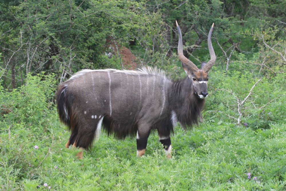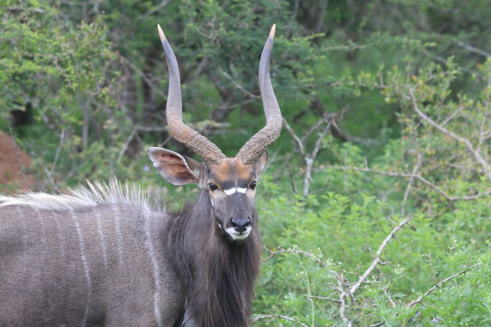 Direkt auf der Campsite streifen Nyala Antilopen entlang, teilweise nur wenige Meter vom Auto entfernt. Und am Wasserloch können wir entspannt Nashörner beobachten.